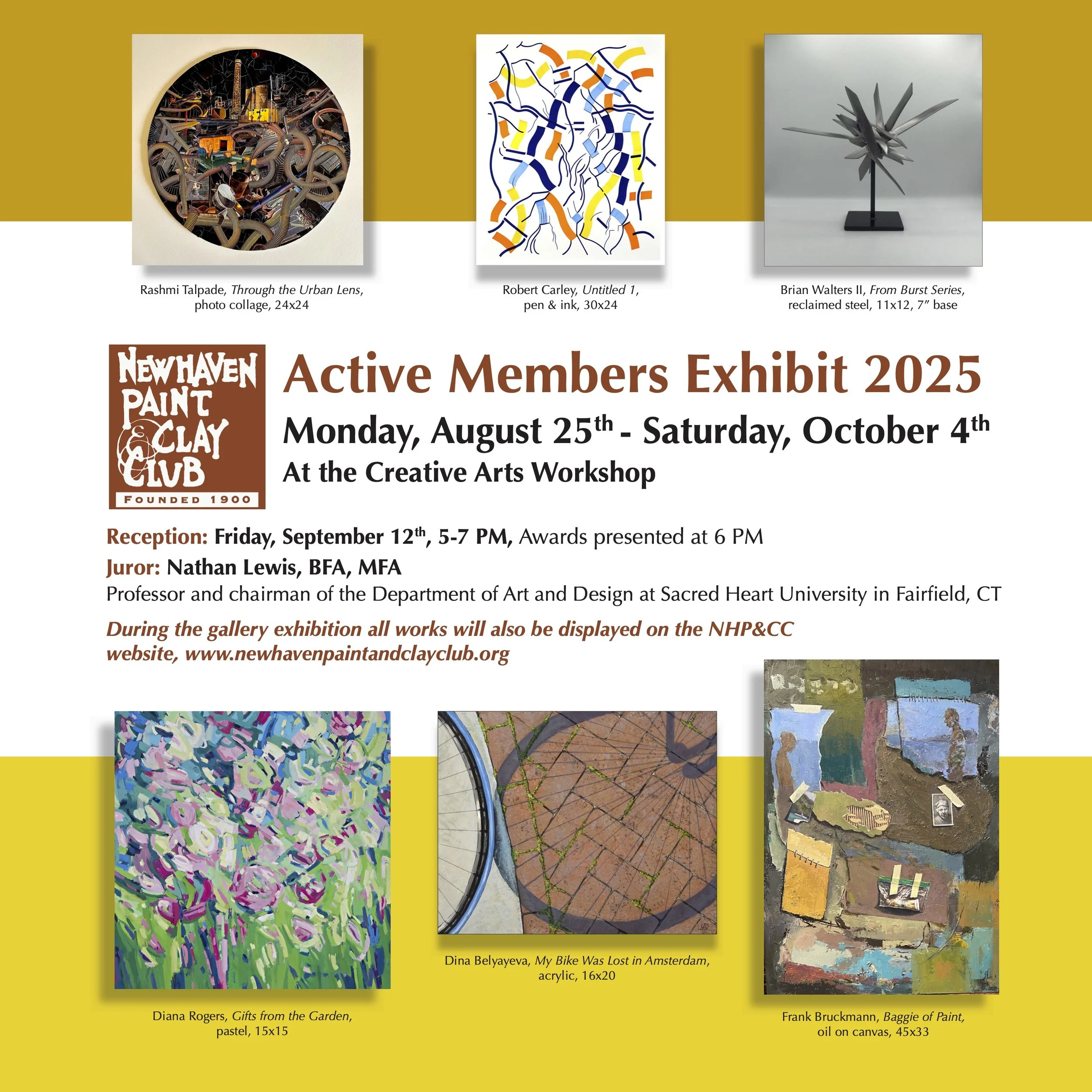2025 Active Members Exhibit opens August 25th /August 23, 2025 by New Haven Paint & Clay Club Reception is Friday, September 12th from 5-7 pm.